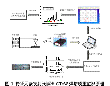 焊接研究中心针对GTAW焊接质量的在线光谱诊断,提出了基于特征元素谱线的检测方法。与目前广泛采用的电子温度法不同,本方法不仅可以对焊接缺陷进行判识,而且还可以根据特征元素信息对引起缺陷的因素进行分析。图3为特征元素发射光谱法的原理图,可以看到,特征谱段具有很好的焊接过程特征信号。该方法可用于GTAW焊的在线缺陷检测,对于热丝TIG焊等自动化优质高效焊接方法的可靠应用,具有很大工业价值。