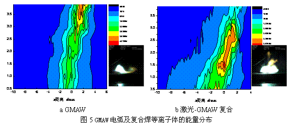 焊接研究中心与哈尔滨焊接研究所、天津大学等单位开展合作研究,对激光-电弧复合焊等离子体的能量分布进行了研究,研究采用空间光谱采集方法,有效获取了等离子体空间的能量分布状态。激光作为先导热源与电弧复合,焊炬与试板呈60°夹角。图5为通过光谱信息,获取的GMAW电弧及复合焊等离子体的能量分布。激光加入改变了等离子体的能量分布,是能量更集中作用于被焊板件,获得了优化的耦合效果。激光-电弧复合焊接等离子体光谱诊断的相关研究,丰富了焊接等离子体光谱理论基础,为激光-电弧复合焊参数优化,耦合机理分析,提供了实验和理论依据。