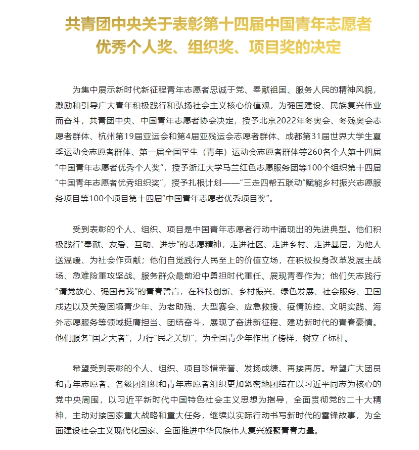 近日,共青团中央、中国青年志愿者协会决定,授予北京2022年冬奥会、冬残奥会志愿者群体、杭州第19届亚运会和第4届亚残运会志愿者群体、成都第31届世界大学生夏季运动会志愿者群体、第一届全国学生(青年)运动会志愿者群体等260名个人第十四届“中国青年志愿者优秀个人奖”,威尼斯人