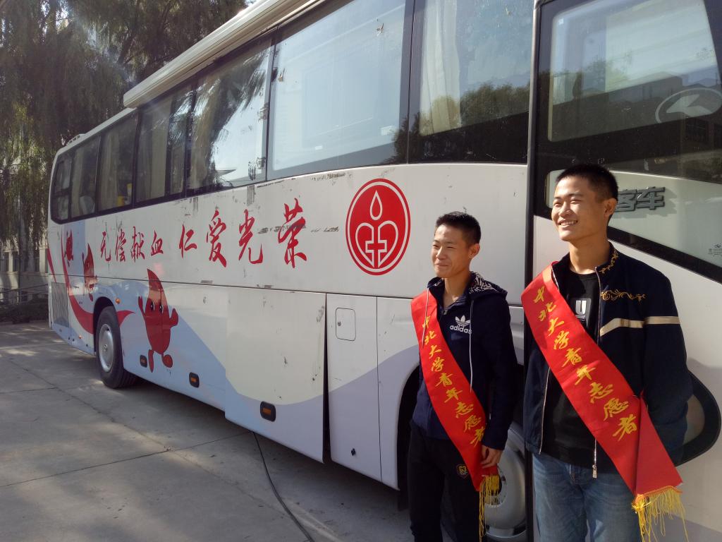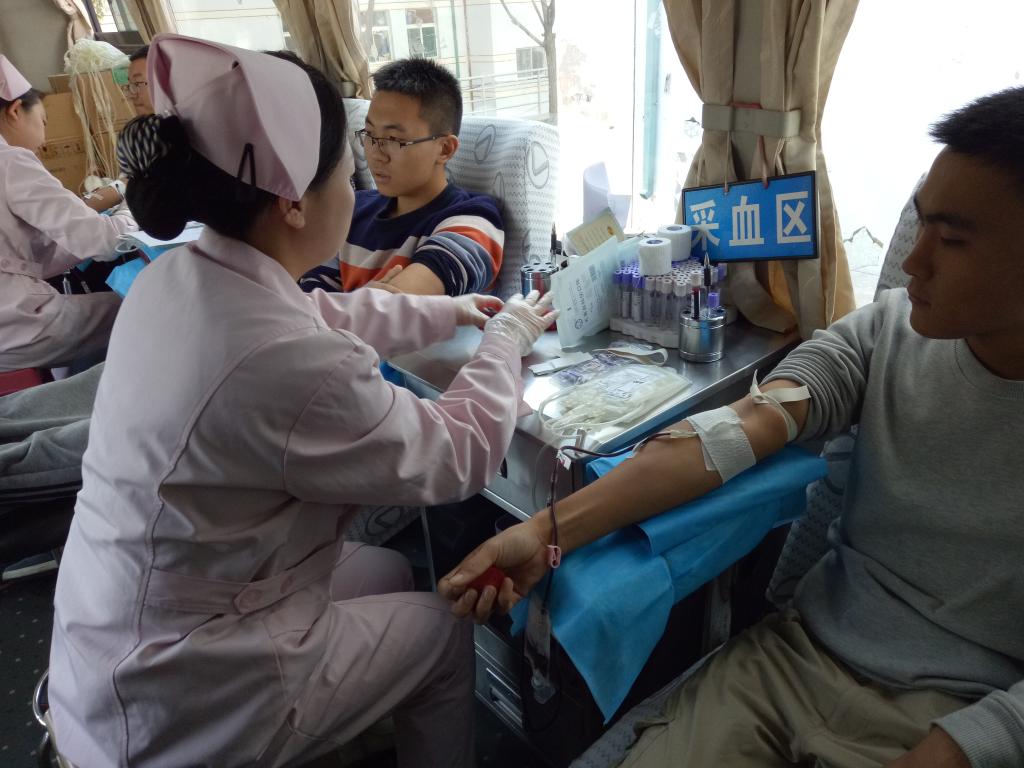 在献血车外,青志部的同学带上绶带,给前去献血的同学提供帮助,才踏入车内就被同学们的热情所感染,车厢内等待献血的同学挤满了车厢,同学们配合医生护士有条不紊的参与了这次活动。采集了血液样本后,就进入车厢后面进行献血,护士阿姨也贴心的准备了葡萄糖液来为献血的同学补充体力。