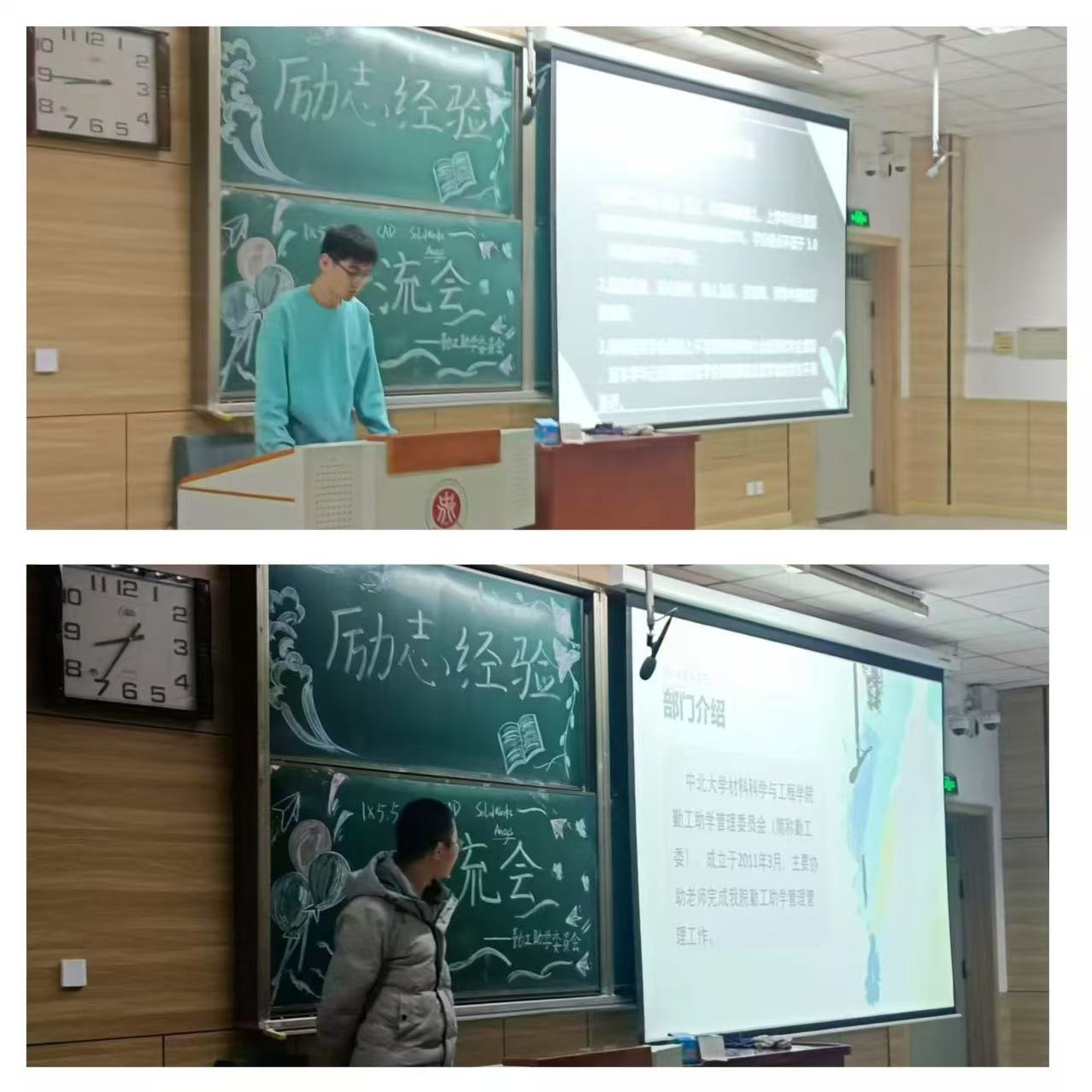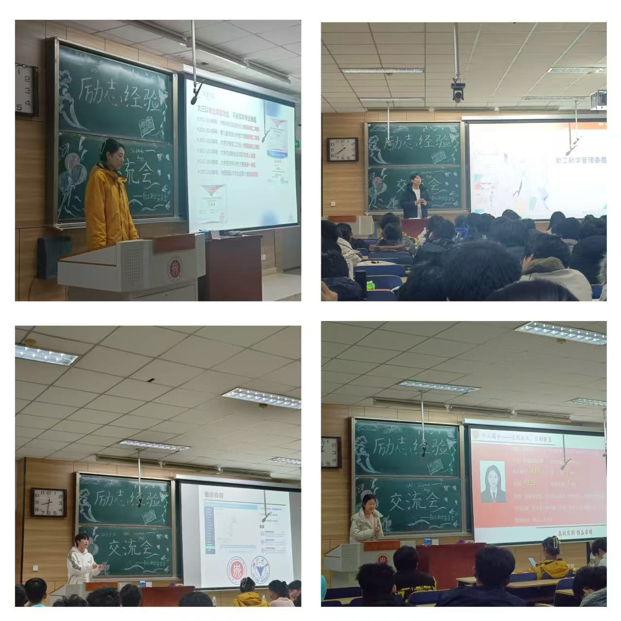 优秀学子裴梅羽、李世晶,潘印良、张钊玮做经验分享,勤工委部长赵文愉、屈贵宁、韩振琛出席,本次经验分享会由曲骏睿、祝依颖以主持。