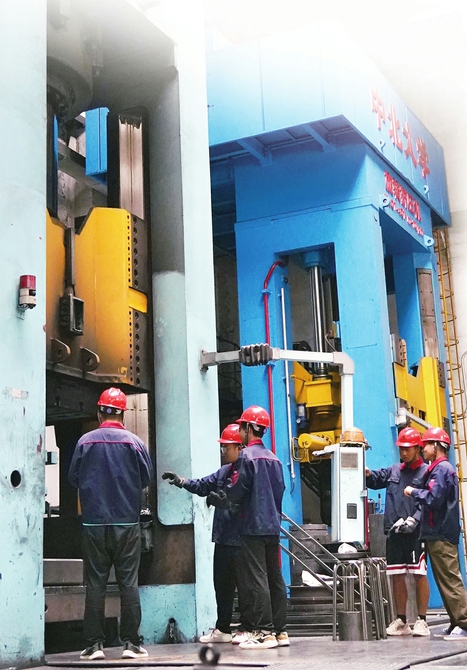 团队成员在做镁合金轮毂挤压成形试制实验。本栏图片由张弘 崔馨摄