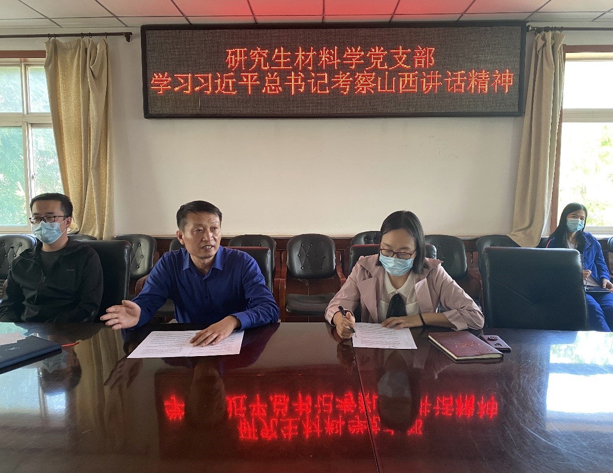 研究生材料学党支部召开支部大会,集中学习习近平总书记考察山西重要讲话精神。会议邀请院党委书记薛亚奎同志参加,全体在校党员参会,未返校同志通过腾讯会议参加。会议由支部书记王燕同志主持。