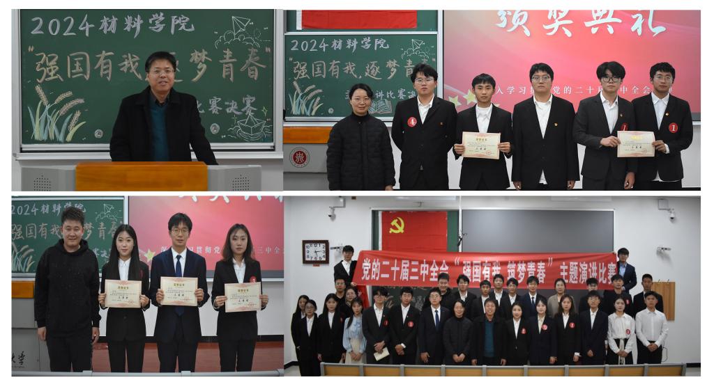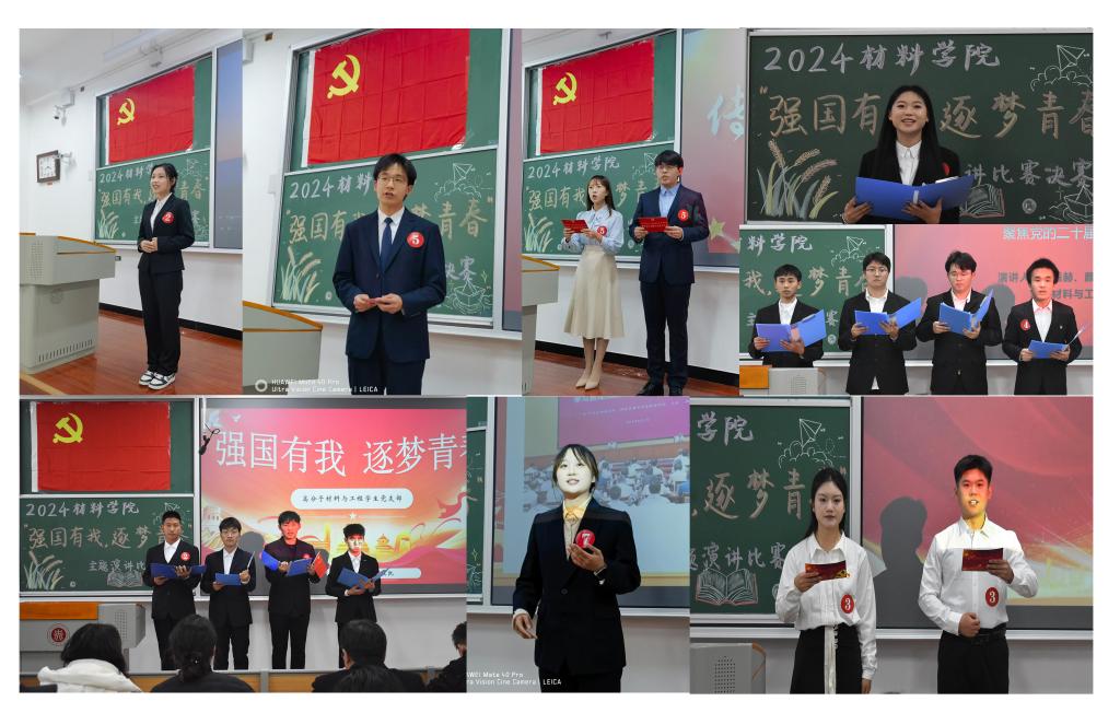 在17201H教室举办了关于党的二十届三中全会精神为主题的演讲比赛。院党委书记廖海洪、院团委书记、高分子复合材料工程中心研究生党支部书记郝诗韵、院党委组织员兼研究生第一党支部书记李艳及各学生党支部书记作为此次决赛评委并出席,活动由无机非金属材料工程学生党支部书记褚嫱主持。